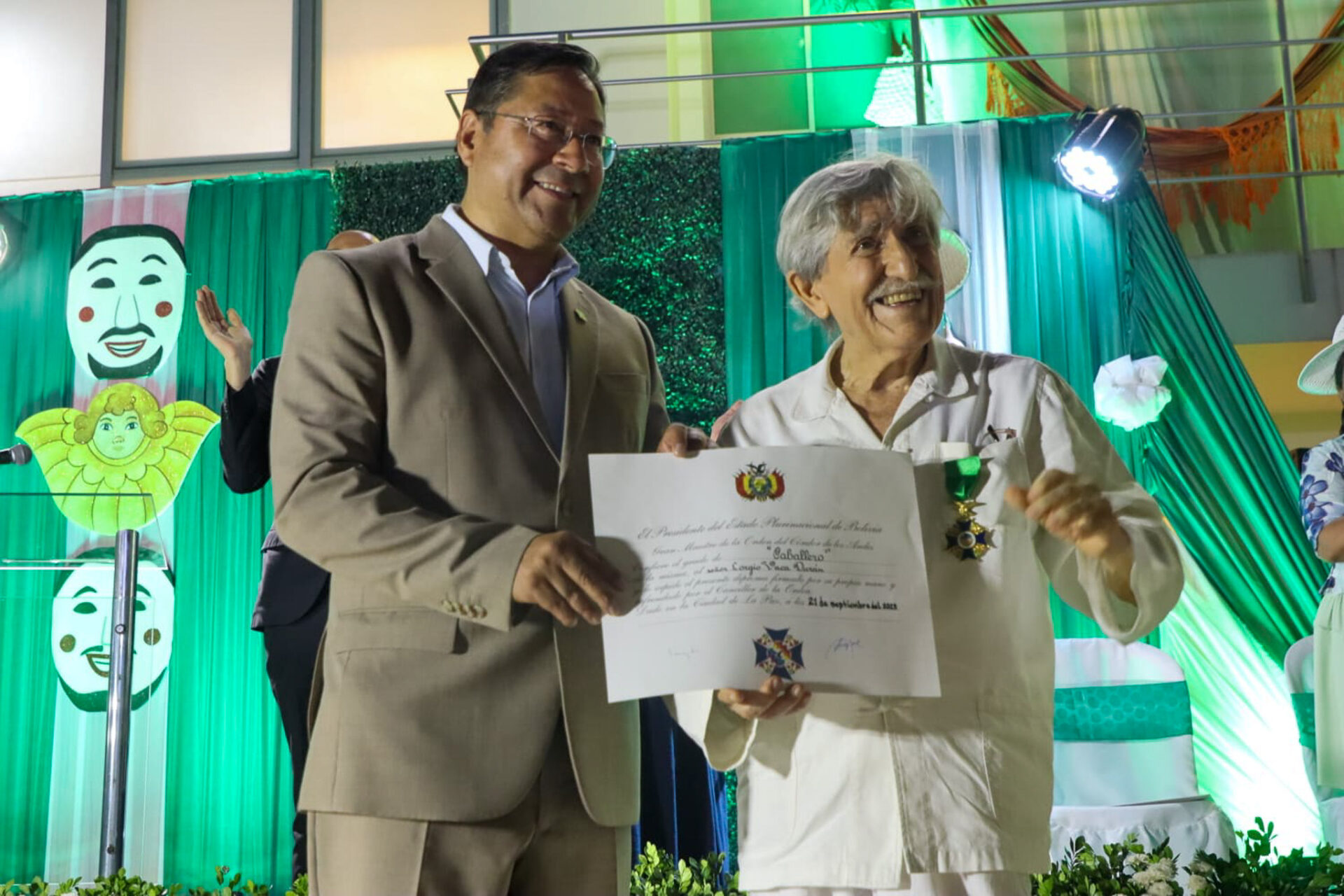 “Hoy estamos haciendo este reconocimiento al hombre que ha puesto a la cultura cruceña y al arte en el más alto nivel, al hermano Lorgio Vaca”, remarcó el Jefe de Estado en la ceremonia que se realizó en la ciudad de Santa Cruz.