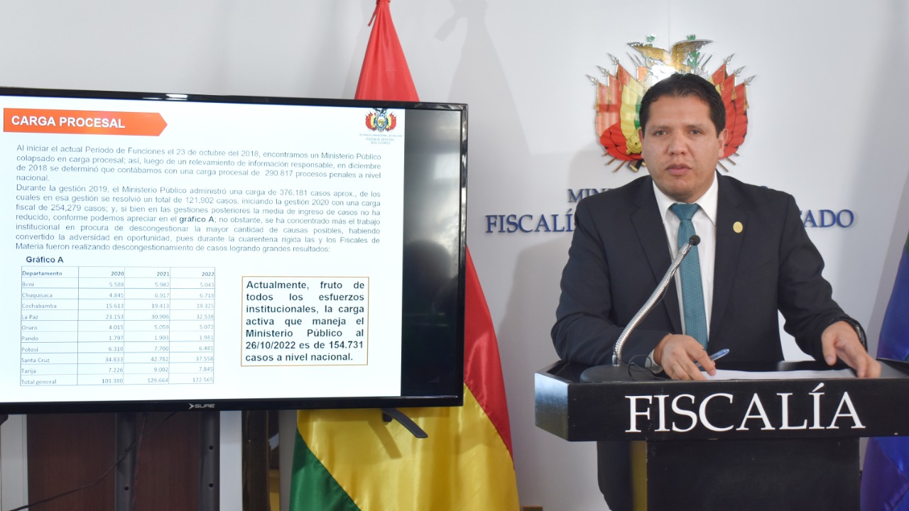 SUCRE, 27 Oct (NÓMADA NEWS).- El Director de Gestión Fiscal, Supervisión y Evaluación, Roberto Almendras, informó este jueves que, luego de cuatro años de gestión del Fiscal General del Estado, Juan Lanchipa Ponce, se evidenció una reducción considerable de la carga procesal en el Ministerio Público, tomando en cuenta que en 2019 se reportó una carga activa de 376.181 casos, mientras hasta el 26 de octubre de 2022 se situó en 154.731 en todo el país, lo que significa 58,86% menos, reducción que refleja las políticas de descongestionamiento y planes para la efectividad en la persecución penal.